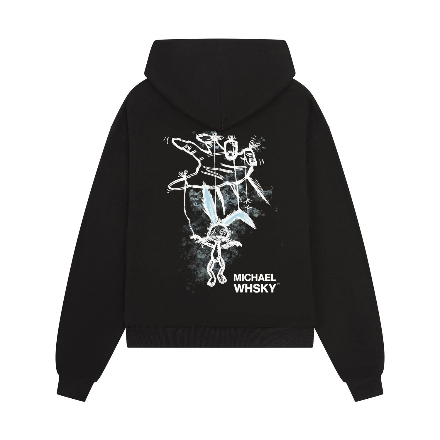Introducing the Heavyweight Michael Whsky Puppet Bunny Hoodie in Black, a modern essential with elevated comfort. Crafted from heavyweight jersey cotton, this slightly oversized hoodie is pre shrunk with a lasting finish and ultra soft feel. Designed with ribbed cuffs and hem for a structured fit, it's finished with Michael Whsky's signature artwork.