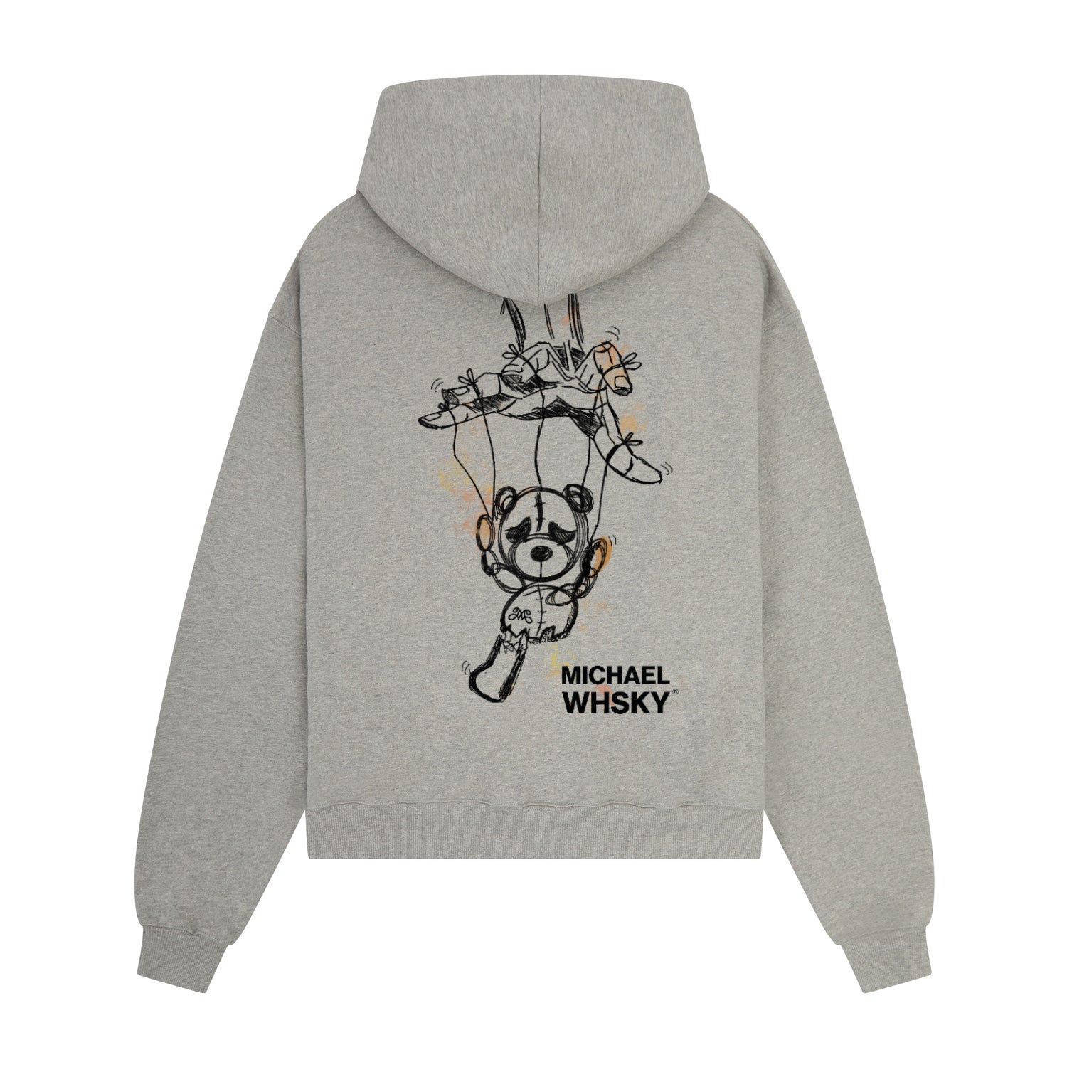 Introducing the Heavyweight Michael Whsky Puppet Teddy Hoodie in Heather Grey, a modern essential with elevated comfort. Crafted from heavyweight jersey cotton, this slightly oversized hoodie is pre shrunk with a lasting finish and ultra soft feel. Designed with ribbed cuffs and hem for a structured fit, it's finished with Michael Whsky's signature artwork.